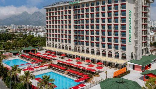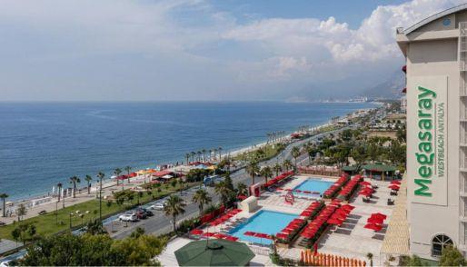 Luxury and Seaside Comfort at Megasaray Westbeach Antalya Set along the stunning Konyaaltı Beach, Megasaray Westbeach Antalya combines modern luxury with Mediterranean charm. The hotel offers spacious rooms with elegant décor, flat-screen TVs, and free WiFi, ensuring a comfortable and relaxing stay by the sea. Stylish Accommodation Each room features luxury bedding and tasteful furnishings, complemented by a private French balcony with breathtaking views of the Mediterranean Sea — the perfect setting to unwind and enjoy Antalya’s coastal beauty. Relaxation & Convenience Guests can take a refreshing dip in the outdoor swimming pool or simply soak up the sun on the terrace. The hotel is conveniently located just 350 metres from Akdeniz Boulevard Bus Stop, providing easy access to Antalya’s main attractions. Prime Location Popular landmarks such as Hadrian’s Gate and Kesik Minaret are only 9 km away, while the Antalya Aquarium is within 2 km. Antalya Airport can be reached in just 20 minutes, and free covered parking is available for guests. Families particularly love the location, rating it 9.3 for a stay with children.